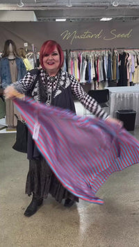 This oversized silky dress is both whimsical and elegant at the same time. Is whimsical resort wear a thing…we think it is! This fun blue and orangey red stripe short sleeve dress is free, cool, fun, and easy breezy to wear