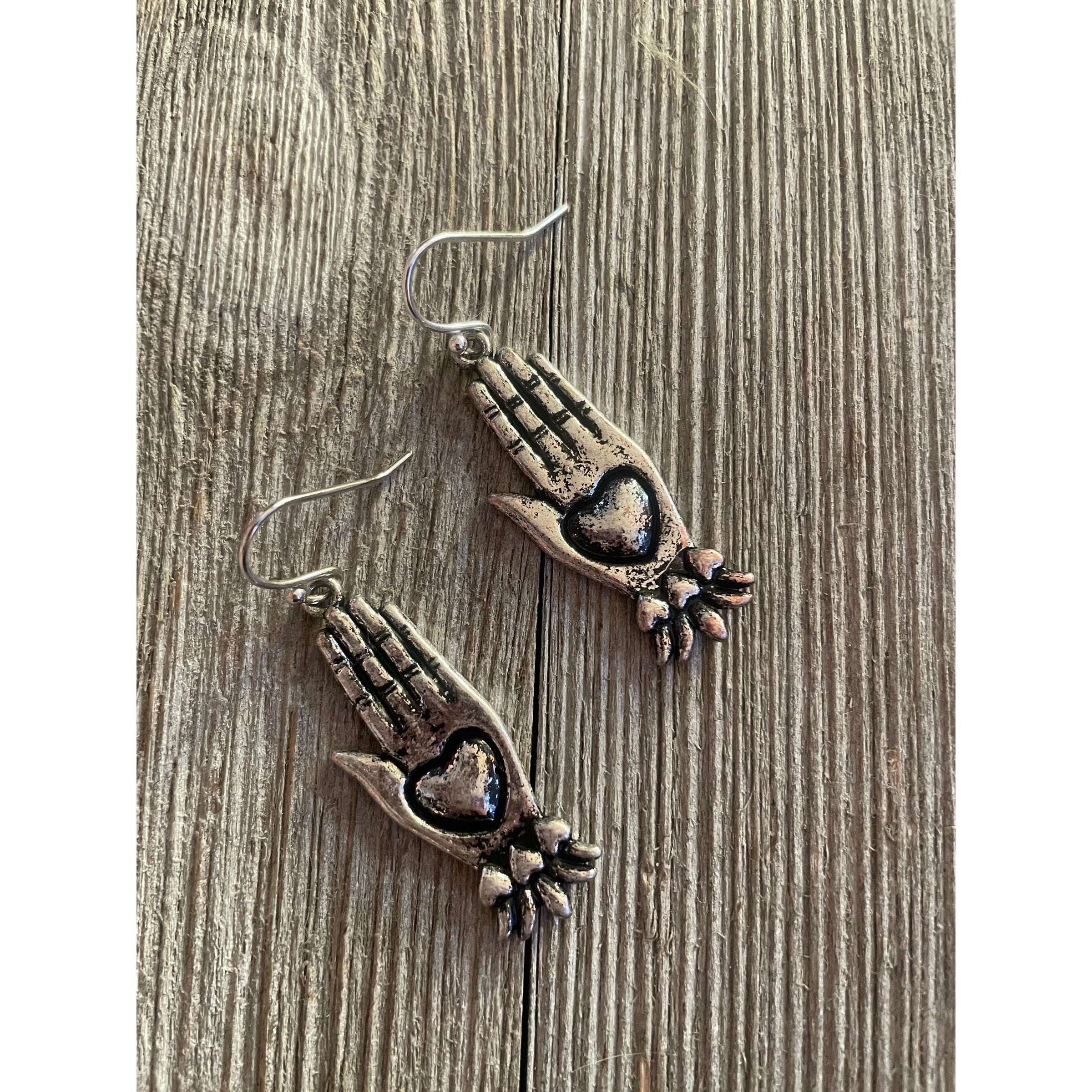 Hand wrought antique silver finish heart in hand earrings. This is a symbol of love, trust, and faith for centuries. Hypoallergenic ear wires