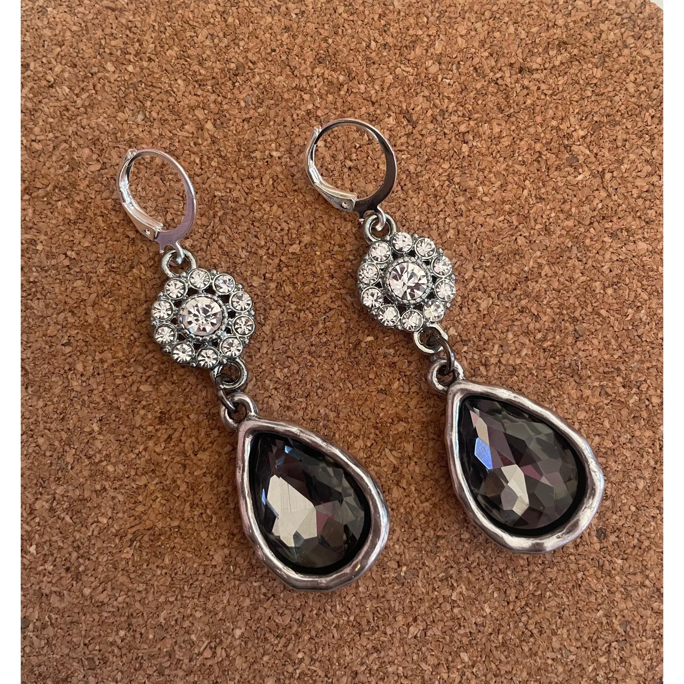 Rhinestone and gray teardrop earrings in silver tone settings. Hypoallergenic backs. Handcrafted by SHD.